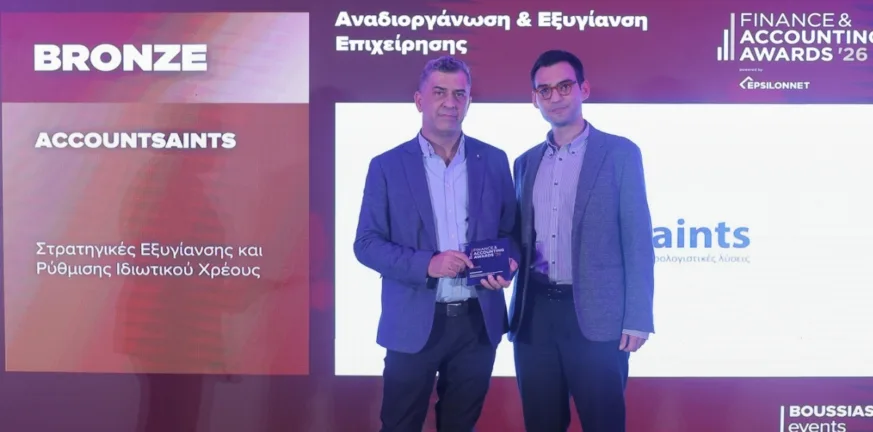 Οι Accountsaints, εταιρεία λογιστικών και συμβουλευτικών υπηρεσιών, έλαβαν Bronze διάκριση στην κατηγορία «Αναδιοργάνωση & Εξυγίανση Επιχείρησης» στα Finance & Accounting Awards 2026. Ο θεσμός αποτελεί σημείο αναφοράς εθνικής εμβέλειας για τον κλάδο της οικονομικής διοίκησης και της λογιστικής. Η διάκριση αναγνωρίζει τη συστηματική προσέγγιση της ομάδας στη ρύθμιση οφειλών, στον εξωδικαστικό μηχανισμό και στην εξυγίανση επιχειρήσεων.