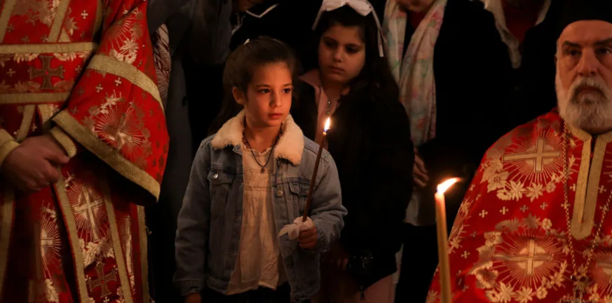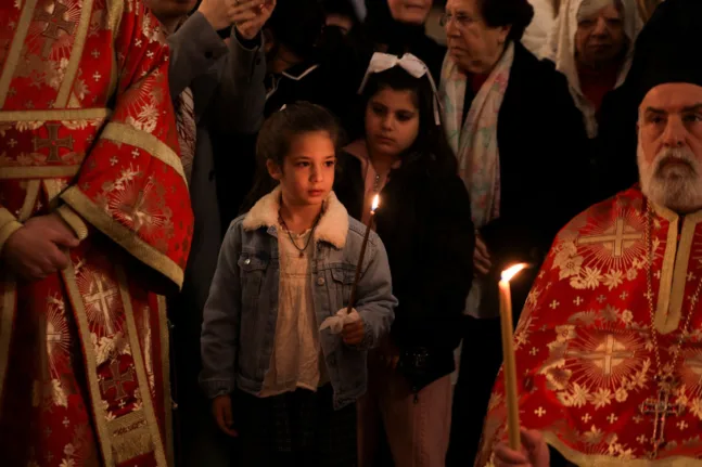 Σε απόσταση μερικών δεκάδων μέτρων, χριστιανοί συμμετέχουν στην πρώτη λειτουργία στη βασιλική του Παναγίου Τάφου.