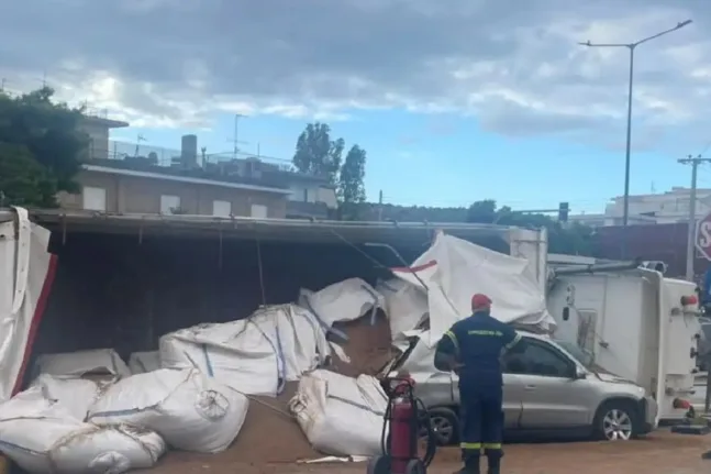 Σοβαρό τροχαίο σημειώθηκε το πρωί της Τετάρτης στη λεωφόρο Ευελπίδων στη Βάρη, όταν νταλίκα που μετέφερε σακιά με χώμα ανετράπη και έπεσε πάνω σε σταθμευμένο αυτοκίνητο. Ο οδηγός εγκλωβίστηκε, αλλά απεγκλωβίστηκε σώος.