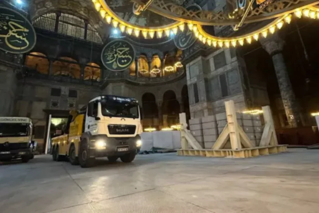 Εικόνες βαρέων οχημάτων να εισέρχονται στο εσωτερικό της Αγίας Σοφίας στην Κωνσταντινούπολη έχουν πυροδοτήσει έντονες αντιδράσεις και ανησυχίες για πιθανές φθορές στο ιστορικό μνημείο, σύμφωνα με αναφορές από τουρκικά και διεθνή μέσα. Οι φωτογραφίες, που κυκλοφόρησαν ευρέως στα κοινωνικά δίκτυα, απεικονίζουν γερανούς πάνω σε φορτηγά και άλλα μηχανήματα να παρκάρουν στο μαρμάρινο δάπεδο, με περιορισμένα προστατευτικά πάνελ να έχουν τοποθετηθεί.