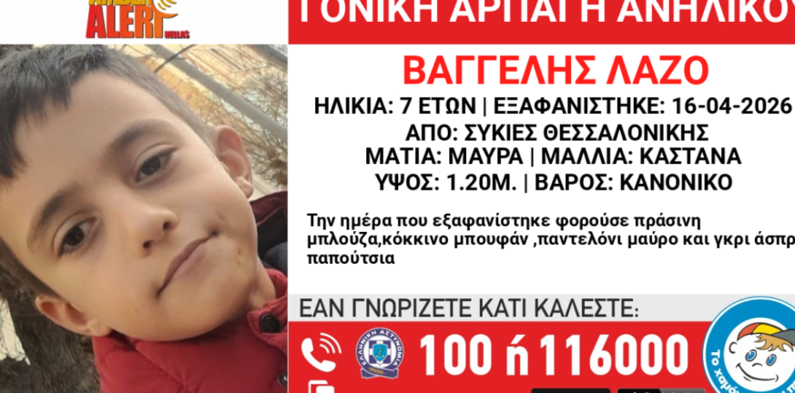 Πατέρας του ανηλίκου στις 16 Απριλίου 2026 προέβη σε αρπαγή του Βαγγέλη (ον.) Λάζο (επ.), 7 ετών, από την περιοχή των Συκεών Θεσσαλονίκης και έκτοτε αγνοούνται. «Το Χαμόγελο του Παιδιού» προχώρησε στην ενεργοποίηση του μηχανισμού Amber Alert Hellas σήμερα, 17/04/2026, κατόπιν εισαγγελικής εντολής, καθώς πιθανόν συντρέχουν λόγοι που θέτουν τη ζωή του ανήλικου σε κίνδυνο.