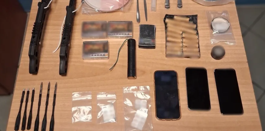 Παράλληλα, εντοπίστηκαν επικίνδυνα αντικείμενα, όπως αυτοσχέδιος δυναμίτης, κροτίδες, λειτουργικές βαλλίστρες με βέλη, καθώς και παιδικά αθύρματα.