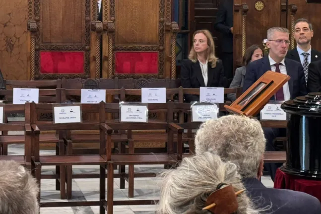 Η φωτογραφία από την πρώτη σειρά των καθισμάτων, τα οποία καταλαμβάνουν οι αρχηγοί, απέναντι από την οικογένεια του εκλιπόντος, δείχνει άδεια καθίσματα.
