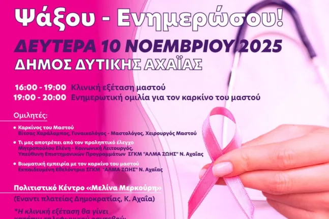 Δωρεάν κλινική εξέταση μαστού από έμπειρο ιατρό κατόπιν ραντεβού στο τηλέφωνο 2693360137, κα Αντωνία Ντέλλα (Νοσηλεύτρια Κέντρου Κοινότητας Δήμου Δυτικής Αχαΐας).
