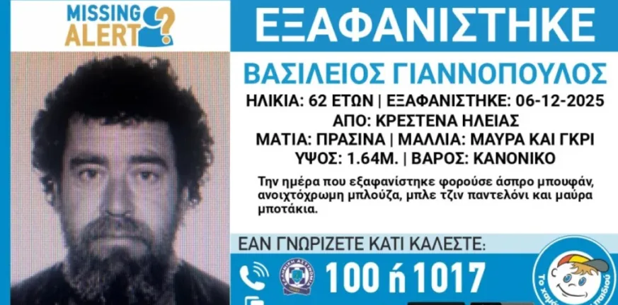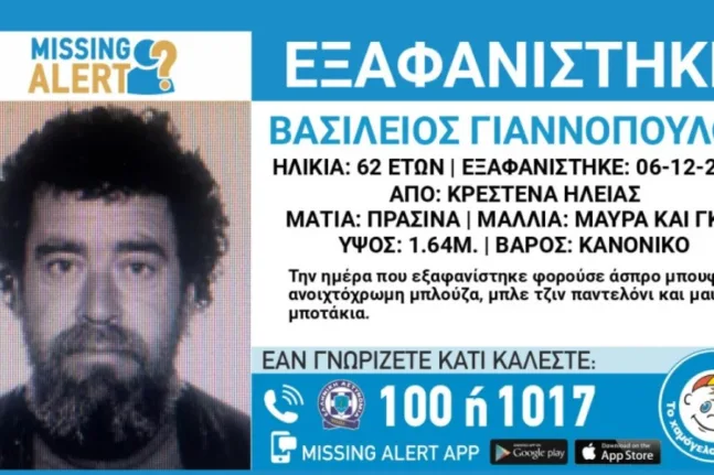 Μάλιστα είχε εκδοθεί και Missing Alert από το Χαμόγελο του Παιδιού για τις αναζητήσεις. Οι έρευνες των Αρχών όλη την εβδομάδα απέβησαν άκαρπες παρότι υπήρξε μεγάλη κινητοποίηση από την Αστυνομία και την Πυροσβεστική Υπηρεσία και με χρήση drone.