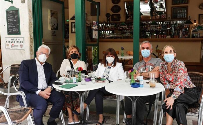 Με μάσκες και μέσα στο… όριο των έξι ατόμων, η Πρόεδρος της Δημοκρατίας Κατερίνα Σακελλαροπούλου «τίμησε» το «άνοιγμα» της εστίασης ύστερα από έξι μήνες.
