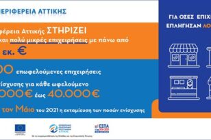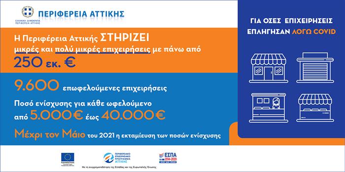 Περισσότερες από 9.600 μικρές και πολύ μικρές επιχειρήσεις που επλήγησαν από την πανδημία του COVID-19 θα λάβουν χρηματική ενίσχυση ύψους 5.000€ έως 40.000€ από την Περιφέρεια Αττικής.
