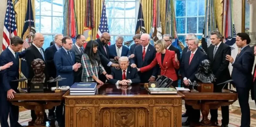 Χριστιανοί πάστορες που βρέθηκαν στο Οβάλ Γραφείο, προσευχήθηκαν για την επιτυχία της Αμερικής μαζί με τον πρόεδρο των ΗΠΑ, Ντόναλντ Τραμπ, το βράδυ της Πέμπτης 5/03/2026.