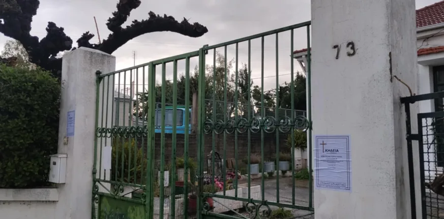 Η εξώπορτα της οικίας τους στην Εγλυκάδα, με τα νεκρώσιμα αγγελτήρια στις κολώνες