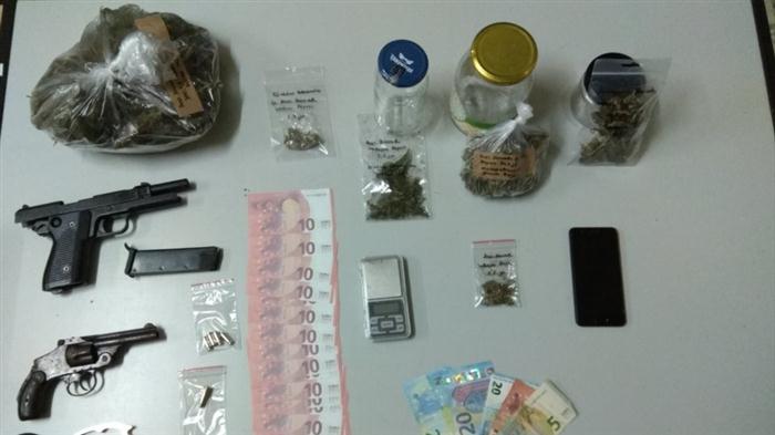 Το μεσημέρι της Δευτέρας έγινε έρευνα στο σπίτι του όπου βρέθηκαν τέσσερις συσκευασίες με ακατέργαστη κάνναβη συνολικού βάρους 225,2 γραμμαρίων και μια ζυγαριά ακριβείας, ένα περίστροφο που εστάλη για βαλλιστική εξέταση, ένα πιστόλι κρότου, πέντε φυσίγγια και μια σιδερογροθιά. Οι αστυνομικοί κατέσχεσαν ακόμη 75 ευρώ, αλλά και 19 χαρτονομίσματα των 10 ευρώ που αποδείχθηκαν πλαστά!