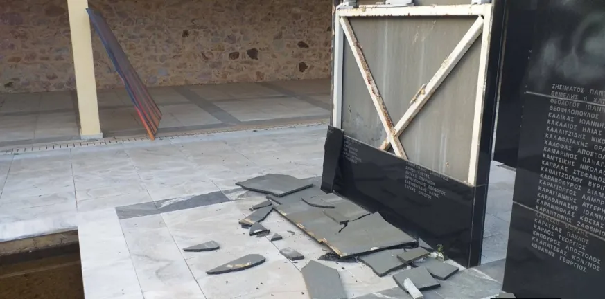 Στο σημείο είναι εμφανείς οι φθορές, καθώς έχουν σπάσει μαρμάρινες πλάκες του μνημείου. Η δημοτική αρχή έχει ήδη τοποθετήσει προστατευτικές κορδέλες, αποκλείοντας την πρόσβαση στα κατεστραμμένα τμήματα.