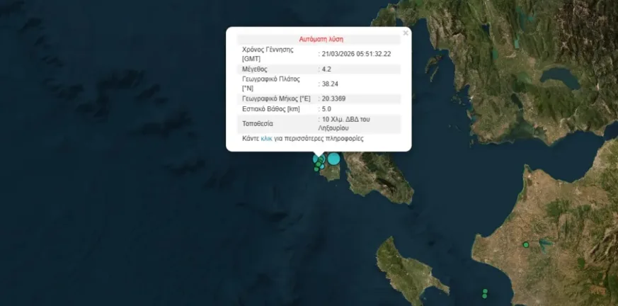 Σεισμός μεγέθους 4,2 βαθμών της κλίμακας Ρίχτερ καταγράφηκε τα ξημερώματα του Σαββάτου 21 Μαρτίου στην Κεφαλονιά, προκαλώντας αναστάτωση στους κατοίκους της περιοχής του Ληξουρίου. Η δόνηση έγινε αισθητή σε αρκετά σημεία του νησιού, χωρίς ωστόσο να προκύψουν μέχρι στιγμής πληροφορίες για τραυματισμούς ή σοβαρές υλικές ζημιές.