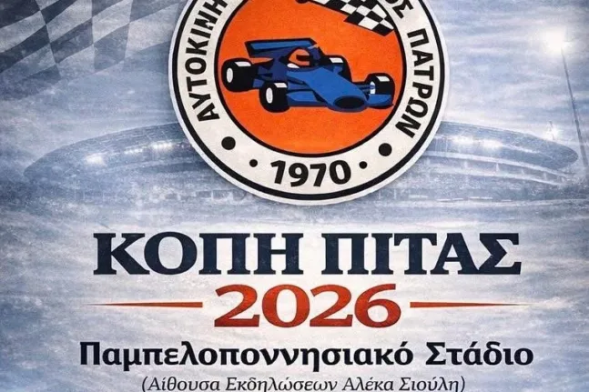 Την ετήσια εκδήλωση Κοπής Πίτας για το 2026 διοργανώνει ο Αυτοκινητιστικός Όμιλος Πατρών, προσκαλώντας μέλη, φίλους και υποστηρικτές σε μια βραδιά με εορταστικό αλλά και συμβολικό χαρακτήρα για την έναρξη της νέας αγωνιστικής χρονιάς.