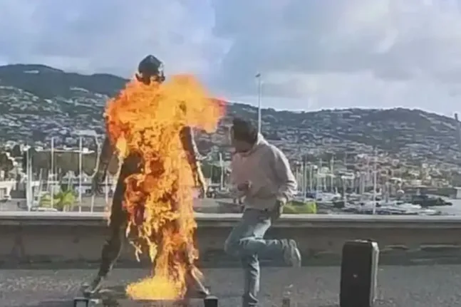 Οι φλόγες τύλιξαν το άγαλμα, την ώρα που ο δράστης χόρευε προκλητικά δίπλα από αυτό και έκανε, μάλιστα και πολλές χειρονομίες.