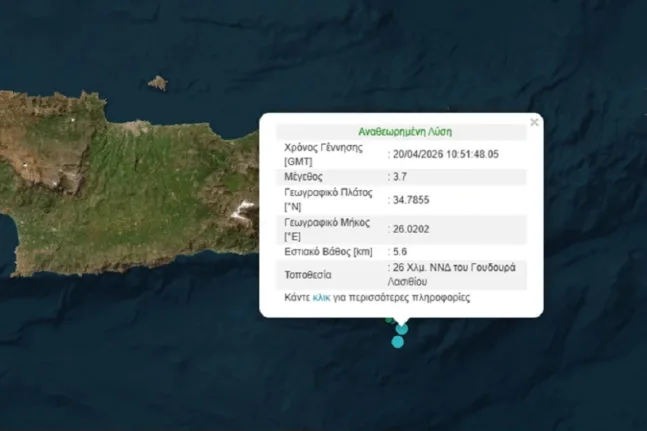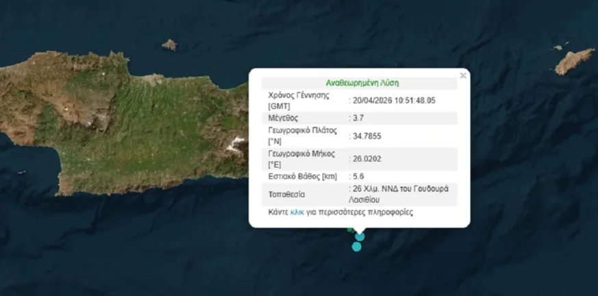 Νέα σεισμική δόνηση σημειώθηκε το μεσημέρι της Κυριακής 20 Απριλίου στα ανοιχτά της Κρήτης, προκαλώντας ακόμη μία καταγραφή σεισμικής δραστηριότητας στην ευρύτερη περιοχή του Λασιθίου. Ο σεισμός έγινε στις 13:51 και, σύμφωνα με την αναθεωρημένη λύση, είχε μέγεθος 3,7 βαθμών της κλίμακας Ρίχτερ.
