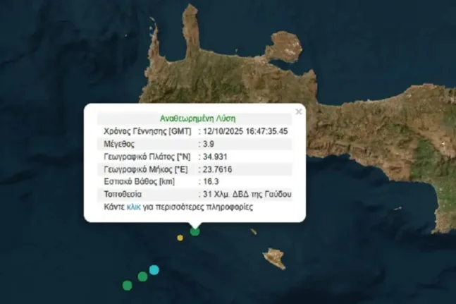Σεισμός 3,9 Ρίχτερ σημειώθηκε το απόγευμα της Κυριακής 12 Οκτωβρίου νότια της Κρήτης και κοντά στη Γαύδο.