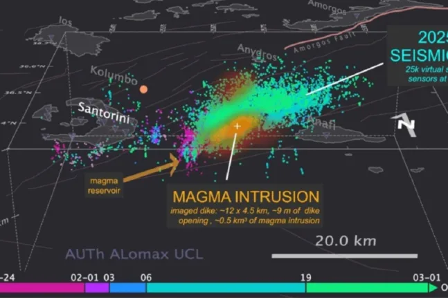 Μια τεράστια μαγματική φλέβα, ικανή –όπως υπολογίζουν οι επιστήμονες– να γεμίσει 200.000 ολυμπιακές πισίνες, βρίσκεται πίσω από την έξαρση των σεισμών που αναστάτωσε τη Σαντορίνη στις αρχές του 2025. Η διεθνής έρευνα, δημοσιευμένη στο Science, αξιοποίησε 25.000 σεισμούς ως «εικονικούς μετρητές τάσης» για να χαρτογραφήσει με πρωτόγνωρη ακρίβεια την πορεία του μάγματος κάτω από τον θαλάσσιο βυθό.