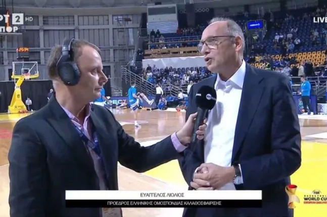 Ο πρόεδρος της ΕΟΚ, Βαγγέλης Λιόλιος μίλησε στην κάμερα της ΕΡΤ στο περιθώριο του αγώνα της Ελλάδας με τη Ρουμανία για όλα τα θέματα αφορούν την Εθνική μας ομάδα μπάσκετ των Ανδρών.