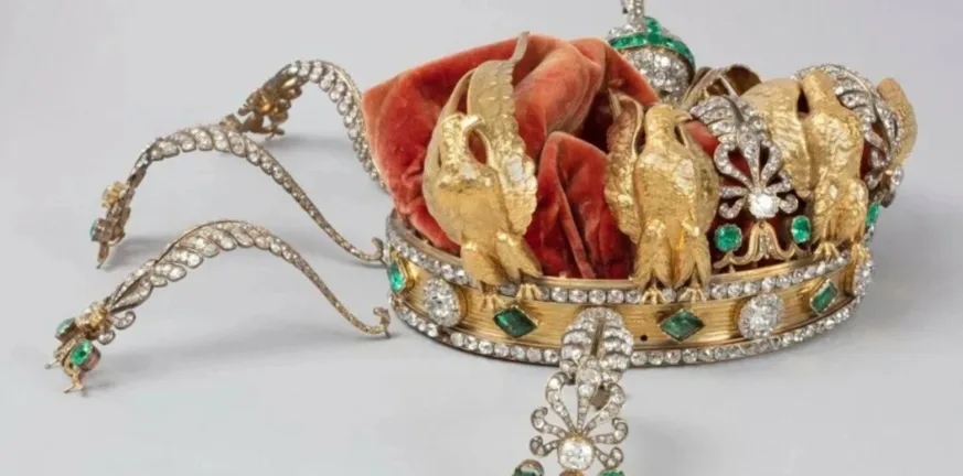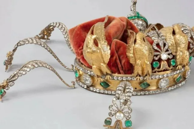 Από το στέμμα απουσιάζει ένας από τους οκτώ χρυσούς αετούς που το διακοσμούσαν. Ωστόσο, παραμένουν όλα τα 56 σμαράγδια, ενώ από τα συνολικά 1.354 διαμάντια λείπουν μόνο 10.