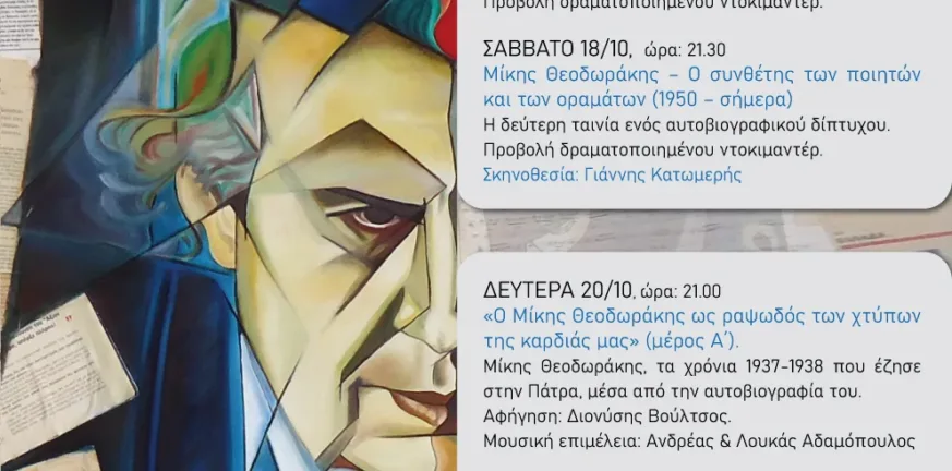 Με το δεύτερο μέρος του αφιερώματος «Ο Μίκης Θεοδωράκης ως ραψωδός των χτύπων της καρδιάς μας», ολοκληρώνονται στις 9.00 το βράδυ της Τετάρτης 22 Οκτωβρίου στο κινηματοθέατρο «Πάνθεον», οι εκδηλώσεις που διοργανώνει ο δήμος της Πάτρας για να τιμήσει τον μεγάλο Έλληνα συνθέτη.