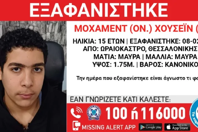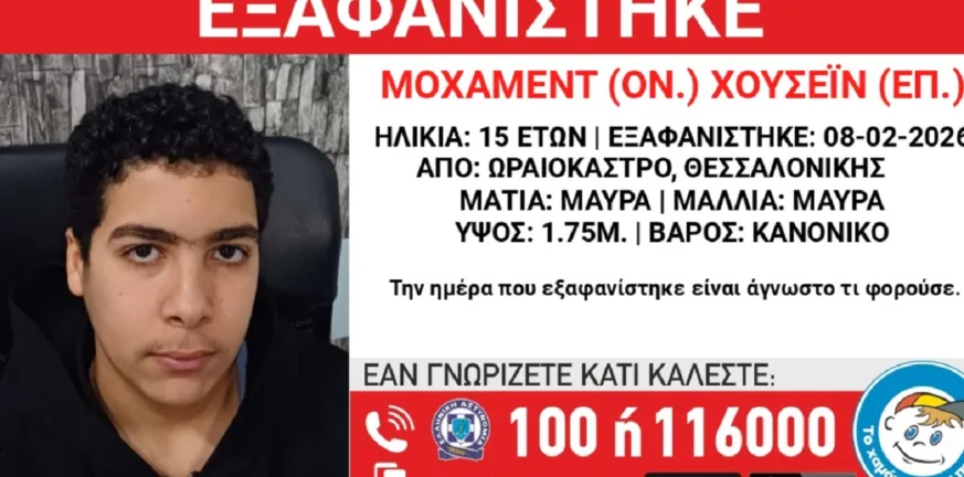Σε εξέλιξη βρίσκεται έρευνα για τον εντοπισμό του 15χρονου Μοχάμεντ Χουσεΐν, αιγυπτιακής καταγωγής, ο οποίος εξαφανίστηκε στις 8 Φεβρουαρίου από χώρο φιλοξενίας ασυνόδευτων ανηλίκων στο Ωραιόκαστρο Θεσσαλονίκης.