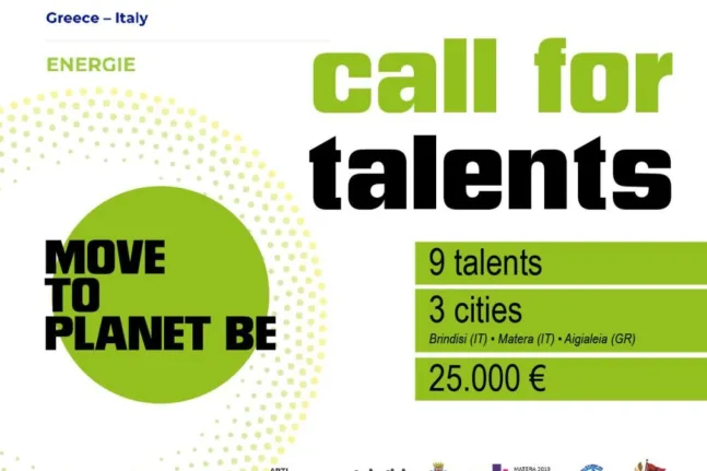 Η ARTI Puglia ανακοινώνει διεθνή πρόσκληση για εννέα νέους επαγγελματίες οι οποίοι θα εργαστούν στο Μπρίντιζι, τη Ματέρα και την Αιγιάλεια (Δυτική Ελλάδα) με αντικείμενο την αστική αναγέννηση, τη βιωσιμότητα και την καινοτομία.
