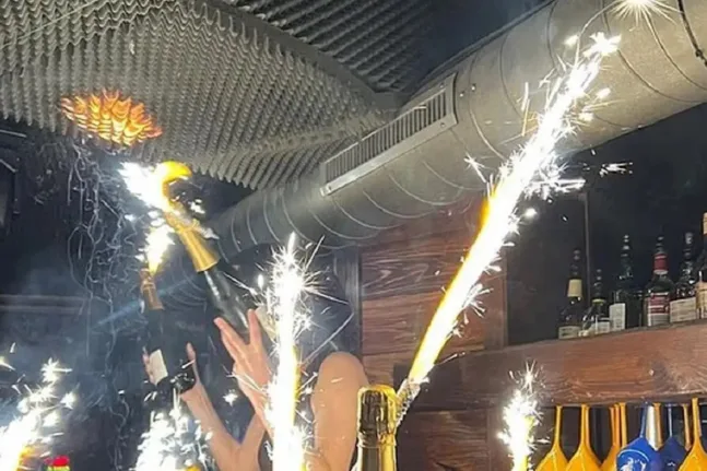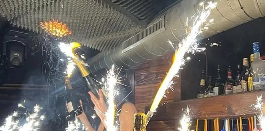 Στο οπτικό υλικό εμφανίζεται σερβιτόρα του καταστήματος να βρίσκεται πάνω στους ώμους άλλου ατόμου, φορώντας κράνος και κρατώντας δύο μπουκάλια σαμπάνιας στα οποία έχουν τοποθετηθεί βεγγαλικά. Η σκηνή φαίνεται να αποτελεί μέρος εορταστικού δρώμενου στο εσωτερικό του χώρου.