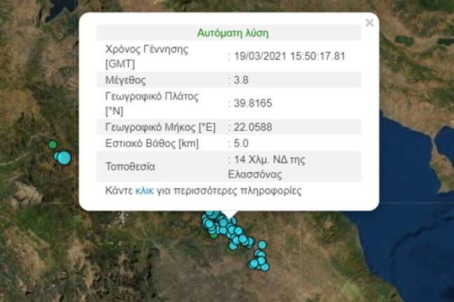 Ο σεισμός έγινε στις 17.50 με επίκεντρο 13 χιλιόμετρα νοτιοδυτικά της Ελασσόνας.