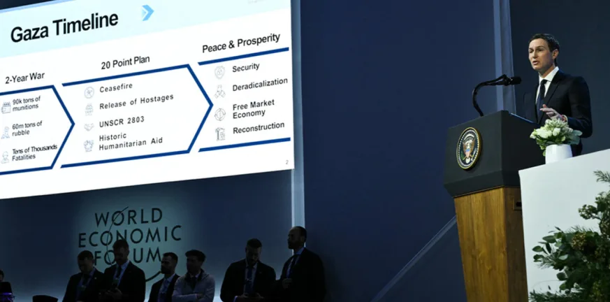 Ένα φιλόδοξο σχέδιο ανοικοδόμησης της Γάζας (την οποία ο ίδιος ο Τραμπ χαρακτήρισε ως ένα «πολύ όμορφο κομμάτι γης»), με εκκίνηση από τη νότια περιοχή και απαιτούμενες επενδύσεις που εκτιμώνται σε τουλάχιστον 25 δισεκατομμύρια δολάρια, παρουσίασε ο Τζάρεντ Κούσνερ κατά τη διάρκεια εκδήλωσης για το «Συμβούλιο της Ειρήνης» στο Νταβός, σκιαγραφώντας ένα αναπτυξιακό όραμα που βασίζεται στην ασφάλεια, την αποστρατιωτικοποίηση μέσω αφοπλισμού της Χαμάς και τις αρχές της ελεύθερης αγοράς.