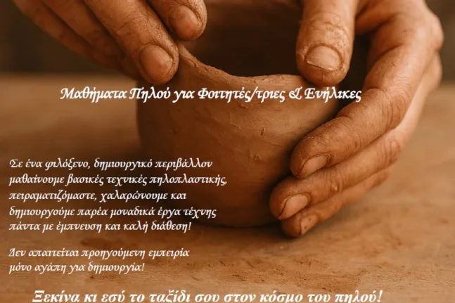 Μια νέα δημιουργική δράση εγκαινιάζει ο Πανηπειρωτικός Σύλλογος Πατρών, προσκαλώντας φοιτητές και ενήλικες να γνωρίσουν την τέχνη της πηλοπλαστικής μέσα σε ένα ζεστό, φιλόξενο περιβάλλον.