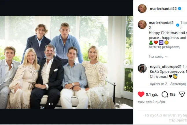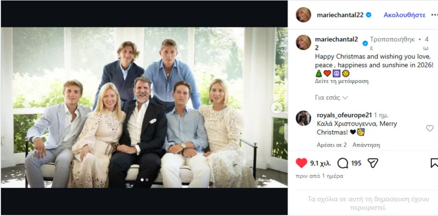 Η Marie Chantal συνόδευσε την δημοσίευση με το μήνυμα: «Happy Christmas and wishing you love, peace, happiness and sunshine in 2026! (Χαρούμενα Χριστούγεννα και σας ευχόμαστε αγάπη, ειρήνη, ευτυχία και φως το 2026)».