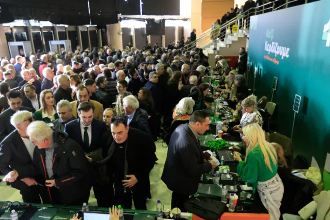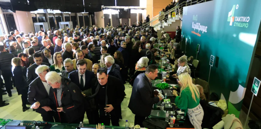 Αν και η κύρια αίθουσα δεν έχει ακόμη γεμίσει, αρκετοί σύνεδροι βρίσκονται στην είσοδο για να παραλάβουν τις διαπιστεύσεις τους.