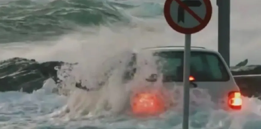 Μέσα στο χάος, ο οδηγός καταγράφηκε σε βίντεο να παλεύει κυριολεκτικά με τα κύματα, προσπαθώντας να φτάσει στο αυτοκίνητό του, την ώρα που το νερό είχε ήδη καλύψει τις ρόδες. Παρά τις εξαιρετικά επικίνδυνες συνθήκες, κατάφερε την τελευταία στιγμή να το απομακρύνει, λίγα μόλις δευτερόλεπτα πριν ένα ακόμη πιο ισχυρό κύμα σαρώσει το σημείο.