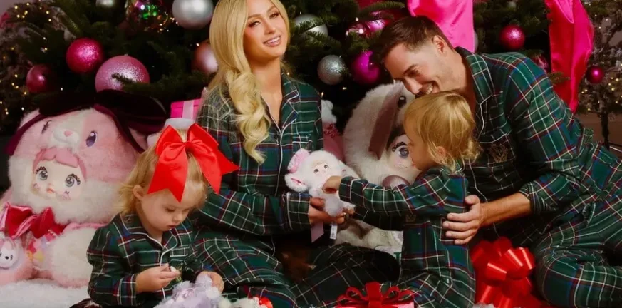 Στις φωτογραφίες εμφανίζεται η Paris μαζί με τον σύζυγό της Carter Reum και τα δύο παιδιά τους: τον γιο Phoenix Barron Hilton-Reum και την κόρη London Marilyn Hilton-Reum. Η οικογένεια ποζάρει φορώντας συντονισμένες πιτζάμες σε χριστουγεννιάτικα μοτίβα – plaid σε αποχρώσεις κόκκινου και πράσινου, με στοιχεία elf και festive λεπτομέρειες. Το σκηνικό περιλαμβάνει επιβλητικό χριστουγεννιάτικο δέντρο διακοσμημένο σε ροζ, ασημί, χρυσό και κόκκινες αποχρώσεις, με φωτάκια, υπερμεγέθη φιόγκους και plush διακοσμητικά, δημιουργώντας μια μαγική, παραμυθένια ατμόσφαιρα στο σπίτι τους στο Beverly Hills.