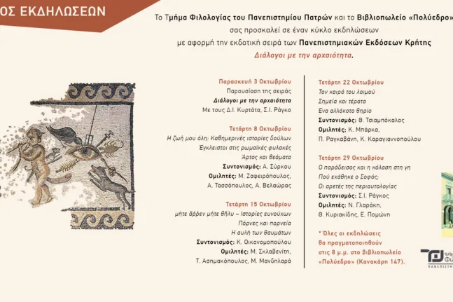 Συνεχίζεται την Τετάρτη 15/10/2025, στις 8 το βράδυ, στο Πολύεδρο, ο κύκλος εκδηλώσεων «Διάλογοι με την αρχαιότητα», με συντονίστρια την Κατερίνα Οικονομοπούλου, Επίκουρη καθηγήτρια Αρχαίας Ελληνικής Φιλολογίας στο Πανεπιστήμιο Πατρών.