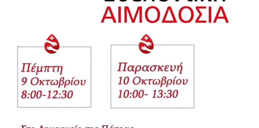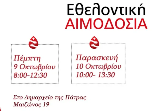 Η αιμοδοσία διοργανώνεται στο Δημαρχείο της Πάτρας (Μαιζώνος 19), σήμερα Πέμπτη 9/10/2025 8 το πρωί με 12.30 το μεσημέρι και αύριο 10/10 Παρασκευή 10 του μήνα, 10 το πρωί, με 1.30 το μεσημέρι.