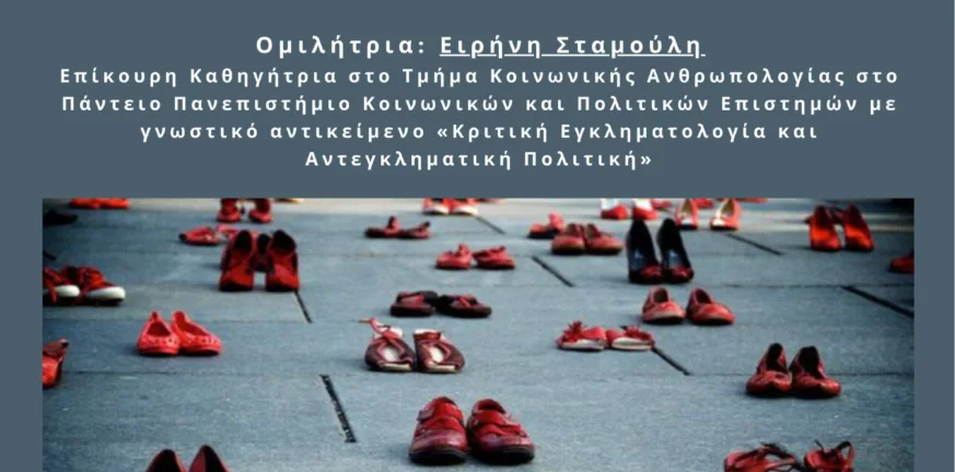 Ομιλήτρια θα είναι η Ειρήνη Σταμούλη, Επίκουρη Καθηγήτρια στο Τμήμα Κοινωνικής Ανθρωπολογίας του Παντείου Πανεπιστημίου Κοινωνικών και Πολιτικών Επιστημών, με γνωστικό αντικείμενο την «Κριτική Εγκληματολογία και Αντεγκληματική Πολιτική».