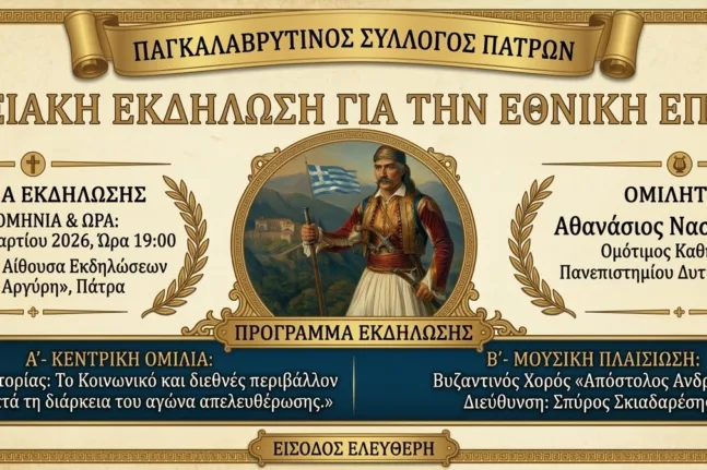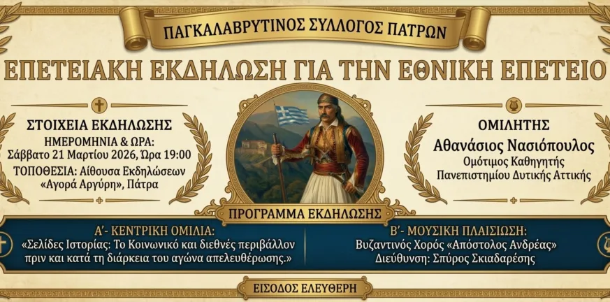 Σε μια επετειακή εκδήλωση με αναφορά στην ιστορική μνήμη και στα ιδανικά της Ελευθερίας και της Εθνικής Ανεξαρτησίας προσκαλεί το κοινό ο Παγκαλαβρυτινός Σύλλογος Πατρών.