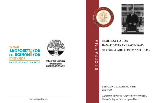 Η Σχολή Ανθρωπιστικών και Κοινωνικών Επιστημών του Πανεπιστημίου Πατρών, σε συνεργασία με την Εταιρεία Φίλων Παναγιώτη Κανελλόπουλου, διοργανώνει ημερίδα αφιερωμένη στη μνήμη του Παναγιώτη Κανελλόπουλου, με αφορμή τη συμπλήρωση 40 ετών από τον θάνατό του. Η εκδήλωση θα πραγματοποιηθεί το Σάββατο 13 Δεκεμβρίου 2025, στις 17.30, στην Αίθουσα Τελετών «Οδυσσέας Ελύτης» του Κτιρίου Διοίκησης του Πανεπιστημίου Πατρών και είναι ανοιχτή στο κοινό.