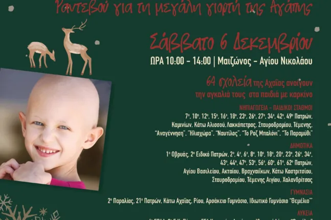 Οι μαθητές και οι μαθήτριες, οι εκπαιδευτικοί, οι Σύλλογοι Γονέων και Κηδεμόνων 64 σχολείων της Αχαΐας και το Παράρτημα Πάτρας του Συλλόγου Γονιών Παιδιών με Νεοπλασματική Ασθένεια «ΦΛΟΓΑ» σας προσκαλούν το Σάββατο 6 Δεκεμβρίου, ώρα:10.00, στην ξεχωριστή Χριστουγεννιάτικη γιορτή που αποτελεί πλέον θεσμό για την Πάτρα, στον πεζόδρομο Μαιζώνος και Αγίου Νικολάου. Όλοι μαζί θα στείλουμε μηνύματα Αγάπης και Ελπίδας στα παιδιά που πάσχουν από Καρκίνο.