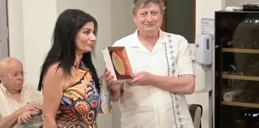 Πάτρα - Θλίψη για τον θάνατο του βραβευμένου λογοτέχνη: Στις Δέλτους ο Δέλτα Ο Αλέξανδρος Πλάτων Δέλτα, κατά την βράβευσή του από την πρόεδρο του Συλλόγου Νέων Καλλιτεχνών Πάτρας, Εφη Αναλυτή, τον Σεπτέμβιο του 2022 στο ξενοδοχείο «My Way»
