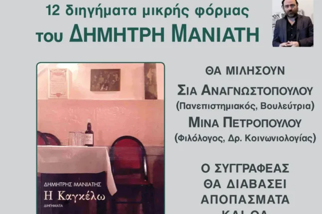 Η παρουσίαση του βιβλίου του δημοσιογράφου και συγγραφέα Δημήτρη Μανιάτη «Η ΚΑΓΚΕΛΩ» – 12 διηγήματα, θα πραγματοποιηθεί στο θέατρο ΑΓΟΡΑ, στην Πάτρα.