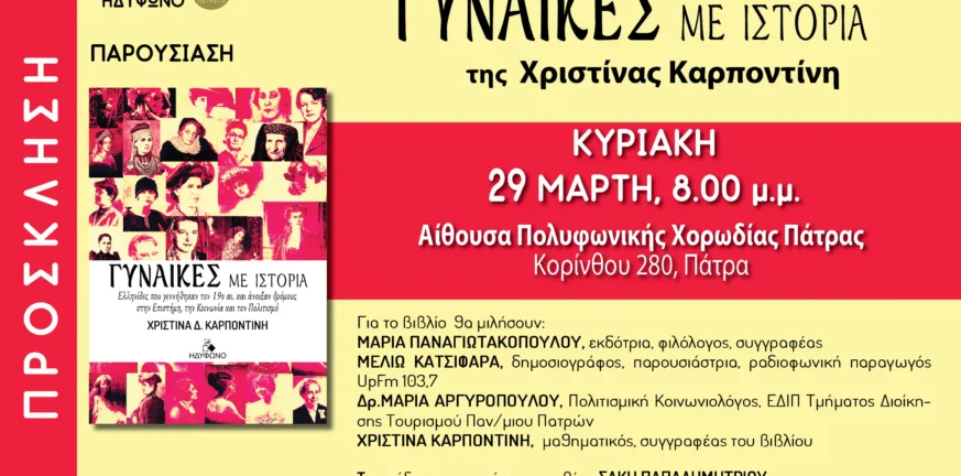 Ένα βιβλίο που στρέφει το βλέμμα σε γυναικείες μορφές με ουσιαστική συμβολή στην επιστήμη, την κοινωνία και τον πολιτισμό παρουσιάζεται στην Πάτρα στο τέλος του μήνα. Το νέο έργο της Χριστίνας Καρποντίνη επιχειρεί να αναδείξει πρόσωπα που σημάδεψαν την εποχή τους, αλλά έμειναν μακριά από τη συλλογική μνήμη.