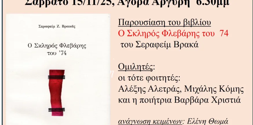 Στην εκδήλωση που έχει προγραμματιστεί για το Σάββατο 15/11/2025, στην Αγορά Αργύρη στην Πάτρα, στις 6.30 το απόγευμα, για τη φοιτητική εξέγερση της Πάταρς το 1973, θα γίνει παρουσίαση του βιβλίου του Σεραφείμ Βρακά « ο σκληρός Φλεβάρης του 74».