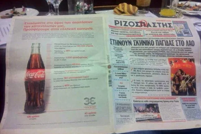 Βέβαια, όταν πρόκειται για το δίκαιο του «Ριζοσπάστη», αλλάζει το πράγμα. Τότε είναι καλοδεχούμενες οι αδρά πληρωμένες καταχωρίσεις της της Coca Cola, της Eurobank κι άλλων ιδιωτικών εταιρειών, που κατά τ’ άλλα πίνουν το… αίμα του λαού.
