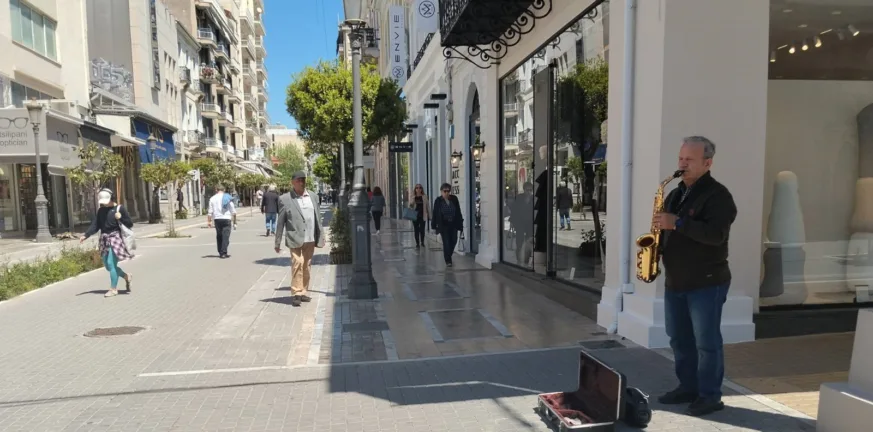 Πάτρα: Υπό διωγμόν οι πλανόδιοι μουσικοί - Νέο περιστατικό χθες στην Μαιζώνος Ο Κώστας Μαλκάς με το σαξόφωνό του, στη συμβολή των πεζοδρόμων Μαιζώνος και Αγίου Νικολάου