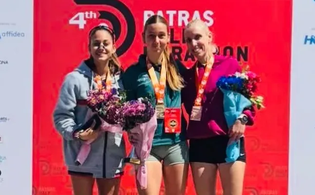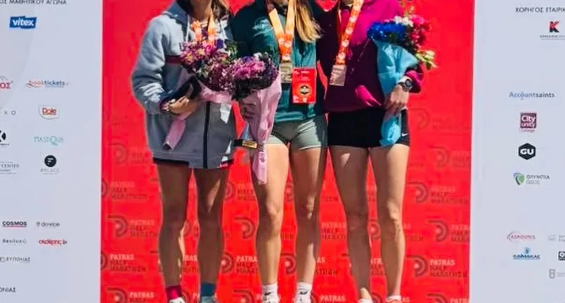 Ειρήνη Τάνταρου, Αγγελική Χριστάκου και Κωνσταντίνα Σταματέλου στο βάθρο στον αγώνα των 5χλμ. στον 4ο Patras Half Marathon.
