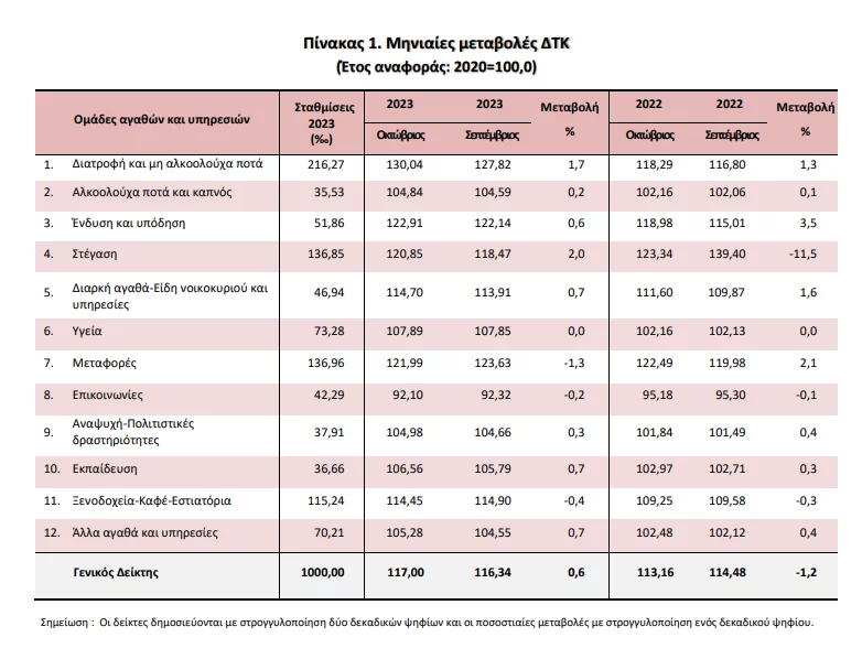 Η αύξηση του Γενικού ΔΤΚ κατά 0,6% τον μήνα Οκτώβριο 2023, σε σύγκριση με τον αντίστοιχο Δείκτη του Σεπτεμβρίου 2023, προήλθε κυρίως από την αύξηση κατά 1,7% στην ομάδα Διατροφή και μη αλκοολούχα ποτά, λόγω αύξησης κυρίως των τιμών σε: άλλα προϊόντα αρτοποιίας και ζαχαροπλαστικής, κρέατα (γενικά), γαλακτοκομικά και αυγά, ελαιόλαδο, νωπά φρούτα, ζάχαρη-σοκολάτες-γλυκά-παγωτά, καφέ. Μέρος της αύξησης αυτής αντισταθμίστηκε από τη μείωση κυρίως των τιμών σε: νωπά λαχανικά, λαχανικά διατηρημένα ή επεξεργασμένα.