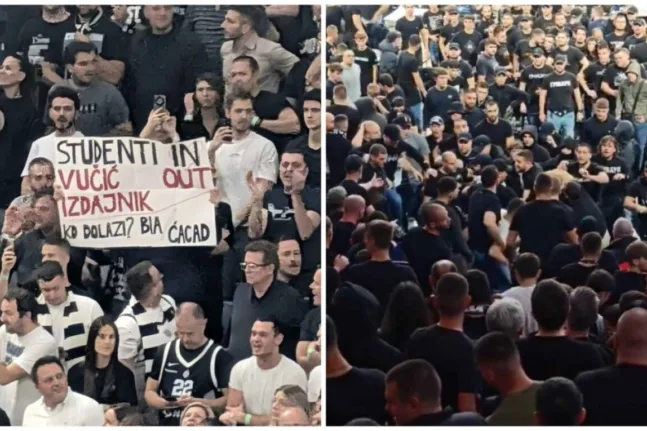 Na utakmici Partizan – Pariz Ćaci napali navijača koji je nosio transparent podrške studentima. Cela sala ustala je u odbranu navijača i transparenta uz skandiranje protiv Vučića. pic.twitter.com/yr9R8eoWq1
