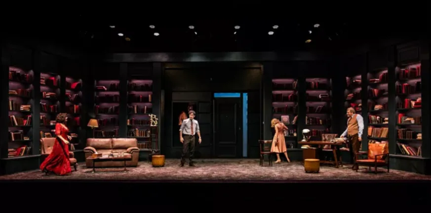 Το σκηνικό της Μαίρης Τσαγκάρη είναι ένα σαλόνι πλούσιου σπιτιού, γεμάτο βιβλιοθήκες, χαμηλούς φωτισμούς και έπιπλα παλιά αλλά καλοδιατηρημένα, δημιουργεί την αίσθηση ενός χώρου ιδιαίτερα φροντισμένου, καλλιεργημένου, σχεδόν προστατευμένου. Κι όμως, μέσα σε αυτό το περιβάλλον αστικής κομψότητας, εκτυλίσσεται μια συναισθηματική σφαγή. Οι φωτισμοί  λειτουργούν ως αφηγηματικό εργαλείο που συνομιλεί διαρκώς με την ψυχική κατάσταση των προσώπων. Με διακριτικές εναλλαγές και προσεκτικά μετρημένες σκιές, αποτυπώνουν τα εσωτερικά αδιέξοδα και τη συναισθηματική ασφυξία των ηρώων. Έτσι, η σκηνή αποκτά βάθος, αλήθεια και μια σχεδόν επικίνδυνη οικειότητα.